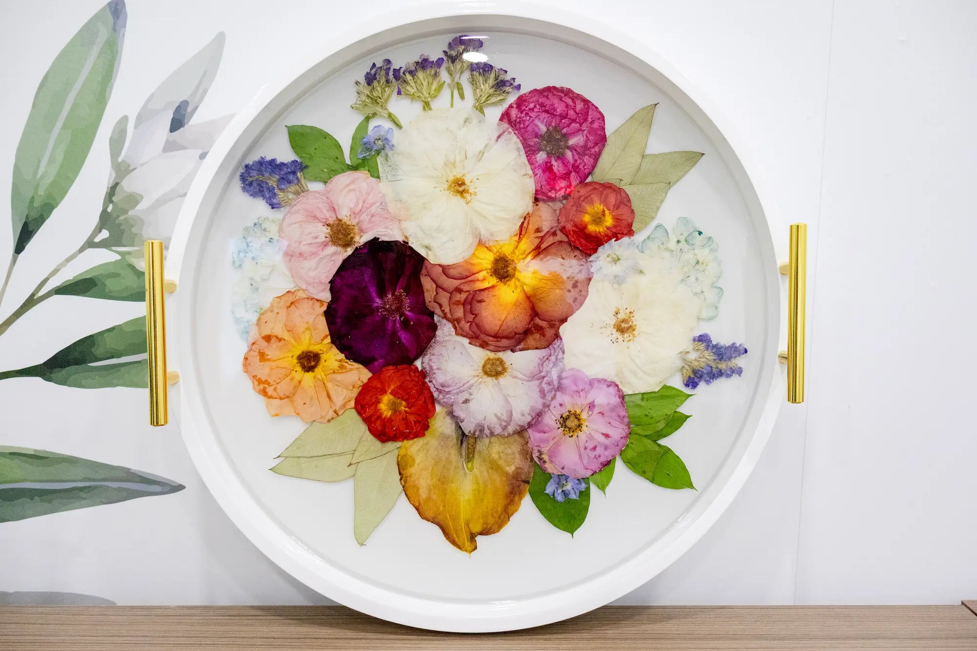 A fresh bouquet is needed for pressed flower items. we’ll professionally press each bloom, preserving the essence of the flower in flat form. This ensures the best possible quality for items that require a thinner, more lightweight format. Often, the centers of the flowers are showcased in the designs.