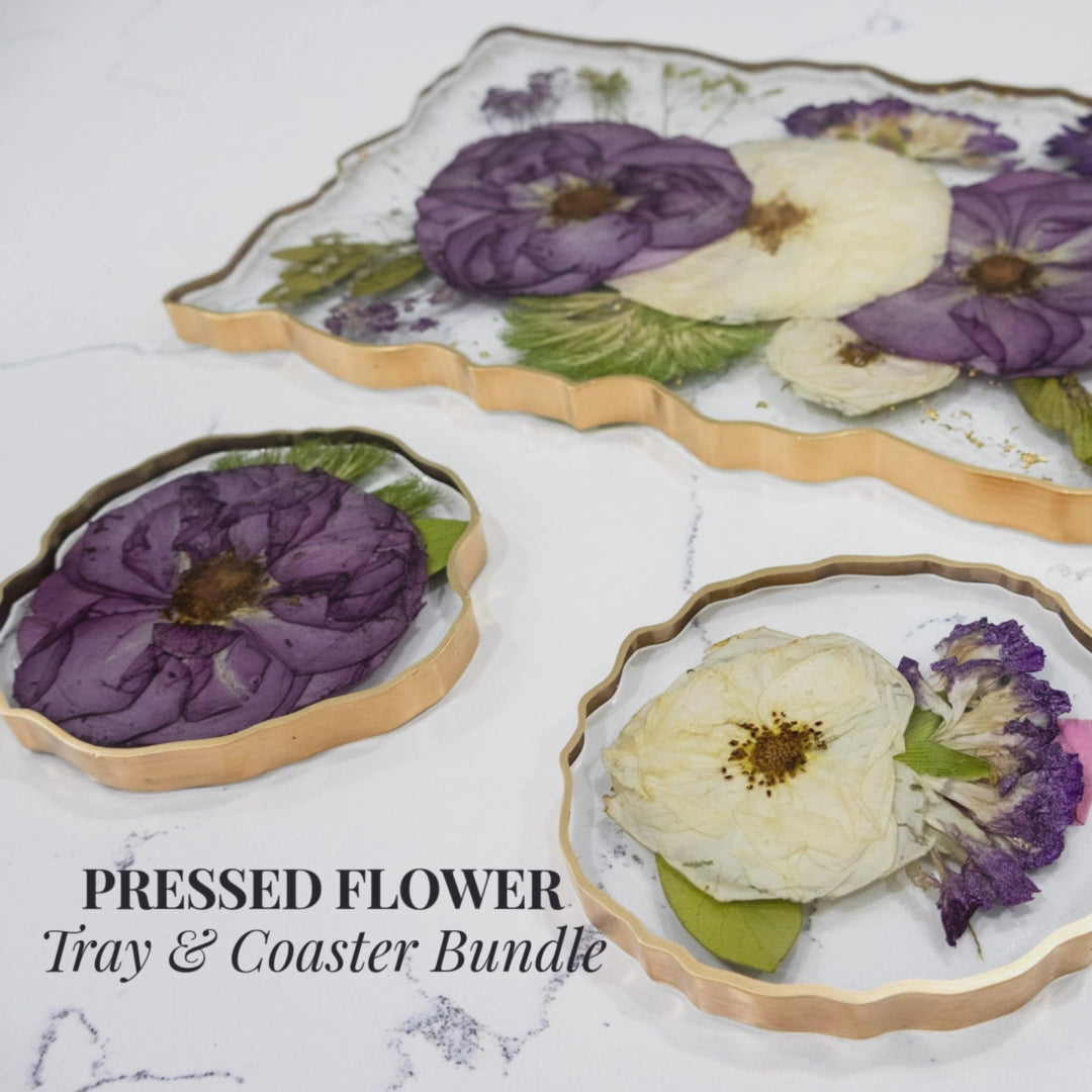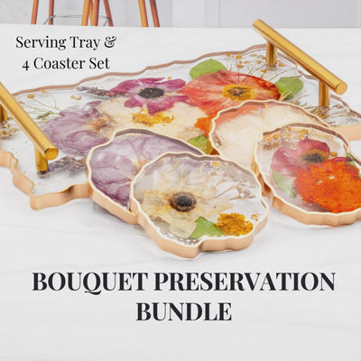 Transform your wedding bouquet into a stunning pressed flower preservation resin tray bundle set through our expert wedding bouquet flower preservation tray service, creating a beautiful resin floral preservation collection that includes a 12x8 geode tray with gold handles plus 2-4 matching coasters in our elegant resin pressed wedding flower tray design - choose from clear or gold painted edges for a coordinated entertaining set that brings your wedding memories to every gathering.