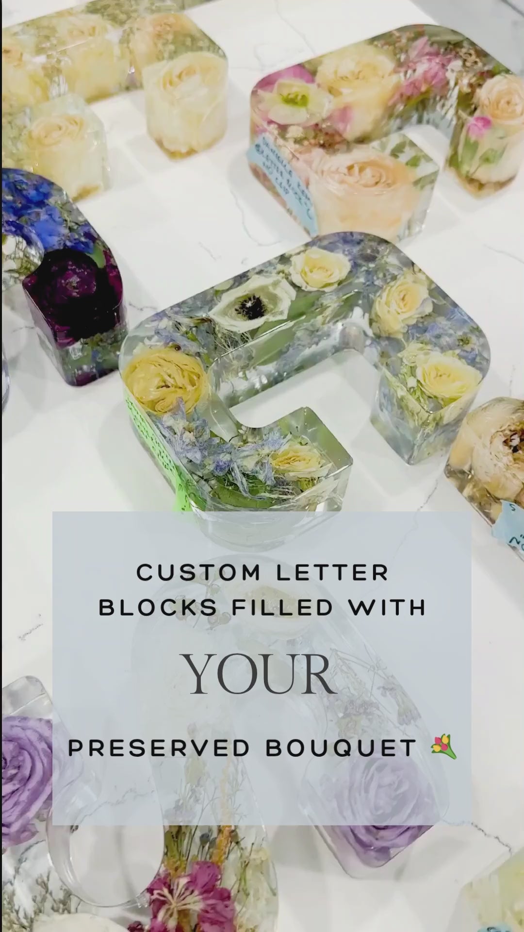 Our Wedding Flower Preservation Letter Blocks transform your bridal bouquet into elegant 6" Preserved Flower Monogram Art, combining premium Resin Preservation with expert Whole Flower techniques to create personalized Wedding Letter Decor that lasts a lifetime. Create an everlasting memory from your special flowers! Our preservation experts help thousands of brides nationwide save money with smart shipping solutions for sending your bouquet in the mail! Our store grew with the support of Etsy customers like YOU! Thank you for considering us as your flower preservation partner.